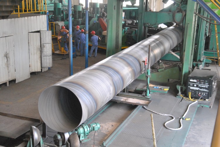 大口徑螺旋焊管是以帶鋼卷板為原材料,經(jīng)常溫擠壓成型,以自動雙絲雙面埋弧焊工藝焊接而成的螺旋縫鋼管.原材料即帶鋼卷,焊絲,焊劑。在投入前都要經(jīng)過嚴格的理化檢驗。 帶鋼頭尾對接,采用單絲或雙絲埋弧焊接,在卷成鋼管后采用自動埋弧焊補焊。 成型前,帶鋼經(jīng)過矯平、剪邊、刨邊,表面清理輸送和予彎邊處理。 采用電接點壓力表控制輸送機兩邊壓下油缸的壓力,確保了帶鋼的平穩(wěn)輸送。 采用外控或內(nèi)控輥式成型。每批鋼管頭三根要進行嚴格的首檢制度,檢查焊縫的力學性能,化學成份,溶合狀況,鋼管表面質(zhì)量以及經(jīng)過無損探傷檢驗,確保制管工藝合格后,才能正式投入生產(chǎn)。 采用焊縫間隙控制裝置來保證焊縫間隙滿足焊接要求,管徑,錯邊量和焊縫間隙都得到嚴格的控制。 大口徑螺旋焊管內(nèi)焊和外焊均采用美國林肯電焊機進行單絲或雙絲埋弧焊接,從而獲得穩(wěn)定的焊接規(guī)范。 采用空氣等離子切割機將鋼管切成單根。焊完的焊縫均經(jīng)過在線連續(xù)超聲波自動傷儀檢查,保證了100%的螺旋焊縫的無損檢測覆蓋率。若有缺陷,自動報警并噴涂標記,生產(chǎn)工人依此隨時調(diào)整工藝參數(shù),及時缺陷。 切成單根鋼管后,每批鋼管頭三根要進行嚴格的首檢制度,檢查焊縫的化學成份,溶合狀況,鋼管表面質(zhì)量以及經(jīng)過無損探傷檢驗,確保制管工藝合格。 焊縫上有連續(xù)聲波探傷標記的部位,經(jīng)過手動超聲波和X射線復查,如確有缺陷,經(jīng)過修補后,再次經(jīng)過無損檢驗,直到確認缺陷已經(jīng)。 帶鋼對焊焊縫及與螺旋焊縫相交的丁型接頭的所在管,全部經(jīng)過X射線電視或拍片檢查。 每根鋼管經(jīng)過靜水壓試驗,壓力采用徑向密封。試驗壓力和時間都由鋼管水壓微機檢測裝置嚴格控制。