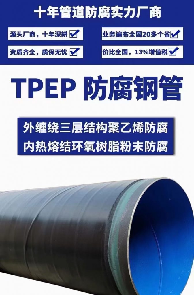 13283262888大口徑TPEP防腐鋼管生產(chǎn)工藝外壁采用熱熔結(jié)纏繞三層結(jié)構(gòu)聚乙烯防腐層,內(nèi)壁采用熱噴涂環(huán)氧粉末的防腐方式,將粉末經(jīng)高溫加熱熔結(jié)后均勻地涂敷在管體表面上。極大提高了涂層附著力及涂層厚度,增強(qiáng)了耐磕碰,耐腐蝕的能力。TPEP防腐鋼管具有糙率小、內(nèi)壁光滑、水力性能良好。通過設(shè)計實例分析得出:與同管徑管材相比,采用內(nèi)壁熔結(jié)環(huán)氧涂層的管路損失可以降低30%以上;在輸送相同流量的情況下,其管徑可以減小一級,從而降低了成本,減少了能耗。TPEP防腐鋼管2009年獲國家實用新型專利,2010年國家火炬項目。